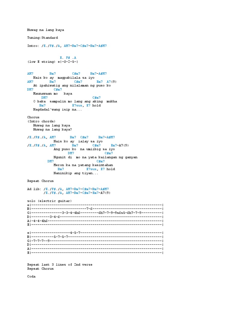 Huwag Na Lang Kaya tab. Huwag na lang kaya. A low E string e-0-2-5- A7 Bm7 Cm7 Bm7 - A7 Nais ko ay magpakilala sa iyo A7 Bm7 Cm7 Em7 A7 9 At ipahiwatig ang nilalaman ng puso ko D7 Cm7 Maunawaan mo kaya D7 Cm7 O baka sampalin mo lang ang aking mukha Bm7 E7sus E7 hold Nagdadalwang isip na.